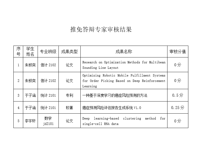 发布时间:2024-09-07根据学校“关于开展推荐2025年优秀应届本科毕业生免试攻读硕士研究生工作的通知”要求,为加强对推免生特殊学术专长的审核,数学与统计学院成立专家审核小组,组织相关学生于2024年09月05日在数统楼204会议室进行公开答辩,对申请推免资格学生的科研创新成果、论文、专利进行审核鉴定。答辩结果公示如下,公示期三天(2024年09月06日至08日)。