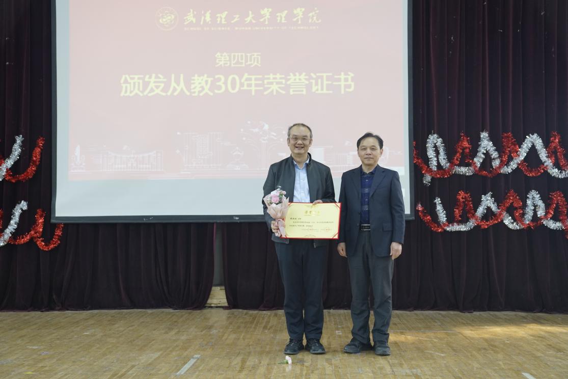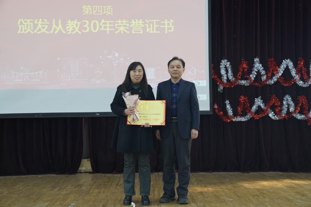 会议第四项,校工会常务副主席李进宏为从教30年教师代表颁发荣誉证书,鼓励年轻教师脚踏实地、潜心育人,在育人、教学、竞赛、科研、学科、师德师风等方面多点开花,全面发展。