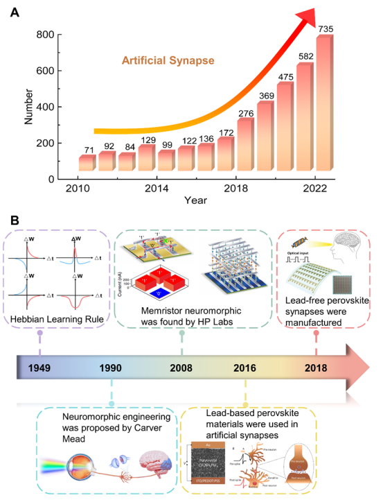 光电神经突触具有巨大的发展潜力,它可以以超低能耗和超快速度来同步传输并处理信息,是解决冯·诺依曼系统瓶颈的方法之一。虽然在过去的几年里,基于不同材料的人工神经突触已经被成功地开发出来,但人工神经突触的工作机制及其性能的评判标准与提升方法并未得到解释。这严重阻碍了生物识别突触的进一步发展,极大限制了其在人工智能中的实际应用。