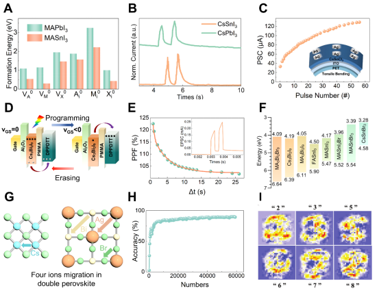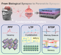 文章基于生物体信息传递的方式,提出了一个人工神经突触的评价标准:PPF指数、LTP持续时间和STDP的实现。并且本文以无铅钙钛矿神经突触为例,系统地介绍了三种参数在钙钛矿突触中的作用机制,包括空位的形成、带隙的调节和空穴电子复合的抑制。最后为了提高人工突触的性能,我们给出了通过替代元素和可选结构来平衡无铅钙钛矿突触的高性能和稳定性的简单方法,促进了钙钛矿突触在人工智能应用中的发展。